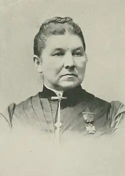 she traces her ancestry back to English sources upon her father's side. In May, 1854, the family removed to Elk River, Minn., where, in 1857, she became the wife of Charles H. Hancock, of that place. Two years after her marriage, having no children of her own, she took to her home an orphan girl, who remained with them until she was married. Later, she took a motherless boy, who remained with them five years. A devout Christian of non-sectarian spirit, she was earnest in the work of various missions carried on by different denominations. The fateful signal gun which boomed out over Fort Sumter found her superintending a Sabbath-school in Elk River. In August, 1862, her husband enlisted in Company A, Eighth Regiment, Minnesota Volunteer Infantry. She sought an interview with General Pope, then stationed in St. Paul, and obtained permission to go with the regiment. The Indian outbreaks along the frontier at that time made it necessary for Minnesota troops to remain in the Northwest, and after the necessary drilling they were assigned by companies to their respective stations in the Sioux and Chippewa countries. Company A was ordered to the Chippewa Agency in September, and thither Mrs. Hancock soon followed. Arriving at the agency, she was assigned to a room in the agency building, which was the headquarters and also served as a hospital for the company. Work was awaiting her, for thirteen of the company were prostrated with measles, which rapidly spread until it attacked every man who had not previously had the disease. In April, 1863, the company were ordered to Fort Ripley, and remained there two months. From Fort Ripley they went to the Sauk Valley. The winter following they were ordered to Fort Abercrombie, Dak., in the Sioux country, where she remained until spring, having shared in all the vicissitudes of camp life on the frontier. Then her health demanded a rest. In Anoka, Minn., in the fall of 1865, her husband was brought to her in the arms of his comrades, that she might once more look upon his face and minister to his last wants. Her interest in the soldier, his widow and his orphans did not cease with the close of the war. In June, 18S5, she joined the Woman's Relief Corps, at the institution of Dudley P. Chase Corps, of Minneapolis, Minn., of which organization she was chosen president. She served in that capacity for two years. On 11th January, 1887, she became the wife of Capt. J. W. George, Company G, Thirty-third Massachusetts Volunteers, one of the most prominent Grand Army men in Minnesota. Captain and Mrs. George worked hand in hand, and their voices were heard at many campfires and patriotic gatherings throughout the districts of the State, and pecuniary assistance was given by them to many enterprises for the assistance of needy comrades. Captain George organized William Downs Post, No. 68. in Minneapolis, and she was interested in the organization of an auxiliary corps, and in January, 1885, at the institution of William Downs Corps, she was elected president. She served in that capacity until she was called to serve the State as its department president. Her husband died in May, 1891. Mrs. George has served the Woman's Relief Corps in many capacities, both in the State councils and in national conventions. She is now actively engaged in temperance work.