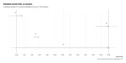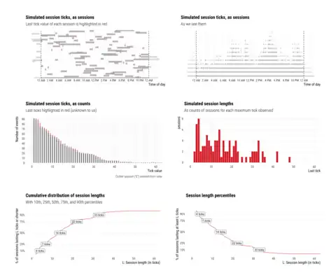 The source of the data is the Session Tick instrument, which manages locally-stored session information – e.g. resets the session after a long enough span of inactivity – and sends "I'm alive" events at a regular interval. These are the ticks. This is illustrated in Fig 1 (which highlights 4 sessions that exemplify 4 different scenarios) and first panel of Fig 2 (which shows 100 simulated sessions).