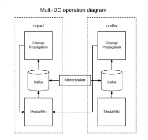 The queue implementation comes with built-in automatic multi-datacenter support. Jobs in each DC are posted to the local Kafka cluster and consumed by a local instances of change propagation service. The execution is dispatched to the master DC by sending requests to jobrunner.discovery.wmnet.