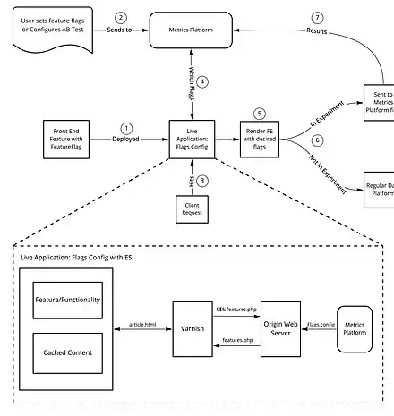 - A header gets set for which feature flags are active. Then can then get analyzed to determine if a user was part of an experiment.