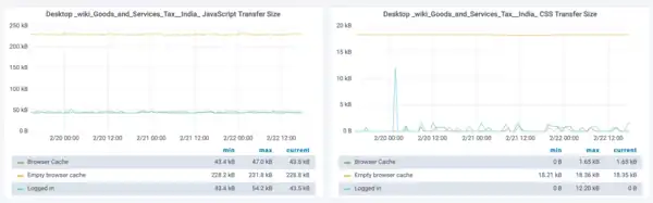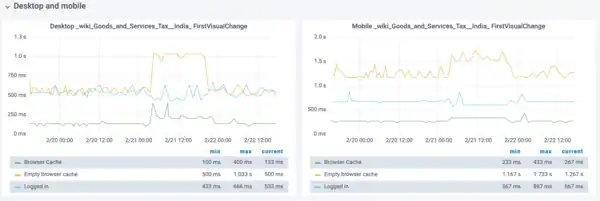We test a couple of different URLs, some URLs need to do more requests and some fewer. We start by taking a look at https://en.m.wikipedia.org/wiki/Goods_and_Services_Tax_(India) that got most request cached when the user has accessed another Wikipedia page before. The first visual change looks like this: