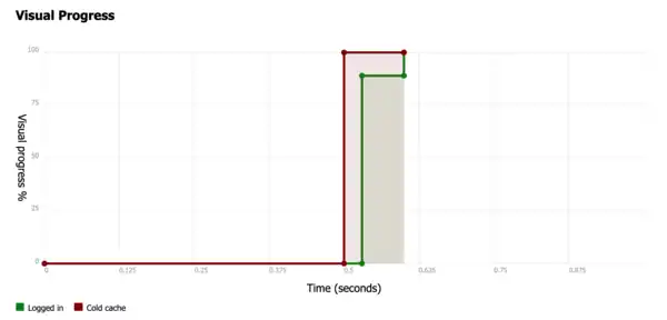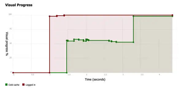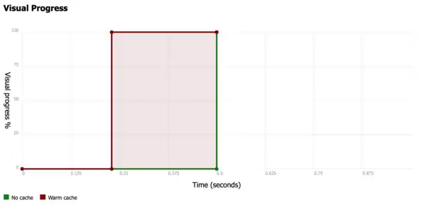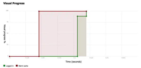 Another way of looking at the metrics is visual progress of the viewport. When 100% is painted the user see everything in the viewport. This is what the progress looks like if we compare a total cold cache (green) with some items cached (red).