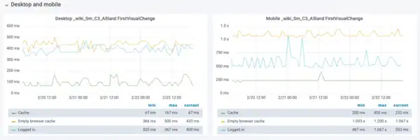 The desktop site has an other patterns for first visual change: Warm cache is always fastest and then sometimes logged in is faster and sometimes no cache.