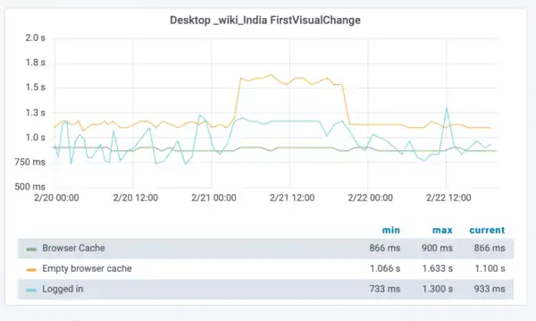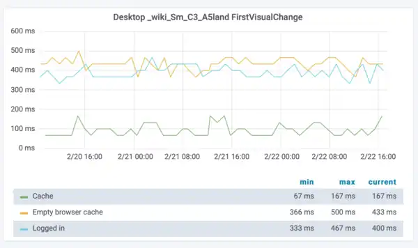Here we can see that users that are not logged in but have visited pages before are the fastest. We can also see that logged in users have a faster first visual change than a user that with a cold cache.