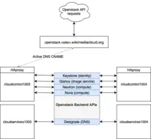 Each region has a dedicated FQDN (openstack.<region>.wikimediacloud.org) which maps to one of the OpenStack controllers running HAProxy. In the event of failure or maintenance this DNS entry will need to be remapped to the other controller in the operations/dns git repository at https://gerrit.wikimedia.org/r/admin/projects/operations/dns