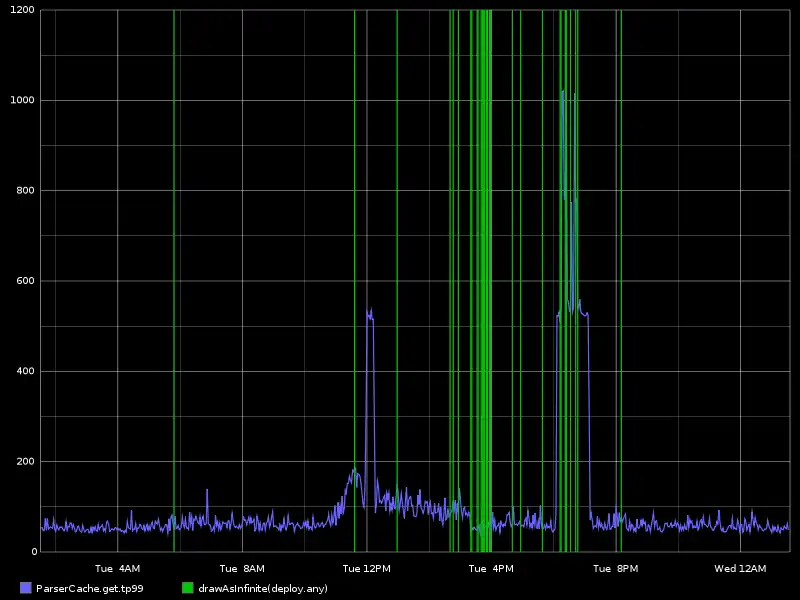 - 99% ParserCache get times, with cluster deploys overlaid as vertical lines