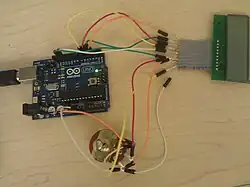 - With the pins above the LCD screen connect pins 1 and 5 (from left to right) to an outer terminal (right) on the 10kΩ potentiometer