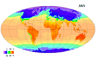 The map at right shows the global long term monthly average surface air temperature for Earth.