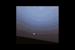 "The rapid dimming of the Sun near the horizon is due to the dust in the sky. There is nearly twice as much dust as there was when the Mars Pathfinder spacecraft, which landed on Mars in 1997, imaged the sunset. This causes the Sun to be many times fainter. The sky above the Sun has the same blue tint observed by Pathfinder and also by Viking, which landed on Mars in 1976. This is because dust in the martian atmosphere scatters blue light forward toward the observer much more efficiently than it scatters red light forward. Therefore, a "halo" of blueish sky color is always observed close to the Sun. We're only seeing half of this halo in the movie, because the other half is below the horizon."[30]