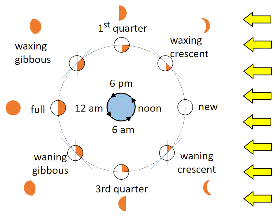 Assume that you are standing somewhere near the equator. It is easiest to begin with 6 PM because that places you on top of the blue circle. The direction 'up' (called zenith)is opposite the direction 'down' (nadir) that points to the center of the earth. At 6 PM, you would see the first quarter moon directly overhead, if the moon is in that phase on that day. If the moon is full, you would see it in a direction perpendicular to the up/down direction. In other words, the full moon would on the horizon at 6PM. The sun is at the other horizon (where it always appears at 6 PM.) The black arrows always represent east. Like time, the concept of east and west depends on where you are situated on earth.