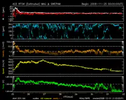 One week of interplanetary magnetic field and solar wind data from the MAG and SWEPAM instruments on the NASA solar wind monitor ACE (Advanced Composition Explorer) is shown in the figure on the right.