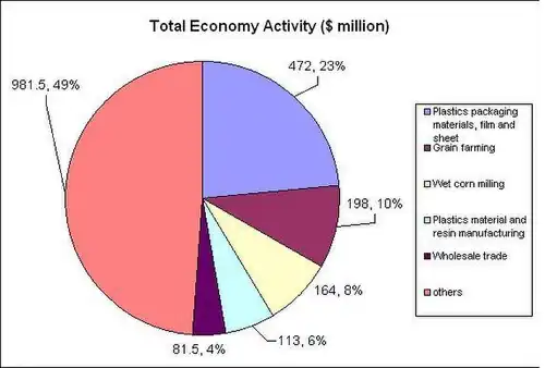For an economic input of $449 million USD for 6 billion bags in 1997, 31% of the production cost of PHA ($377 million) is attributed to the grain farming sector, 5% of the cost is attributed to the agriculture and forestry support activities sector, 43% of the cost is attributed to the wet corn milling sector, and 20% is attributed to the “All other industrial machinery manufacturing” sector.