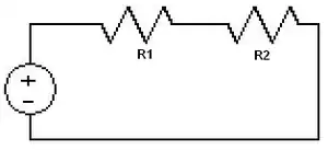 Lets take the two-resistor problem first. There is a voltage source with two resistors in series. We know that the overall voltage drop across the two resistors is the same as the voltage the source is supplying in our example world. So the voltage drop across one resistor would be a portion of the overall drop. What proportion would we use to figure out the answer? One resistor over the two added together times the overall voltage drop: