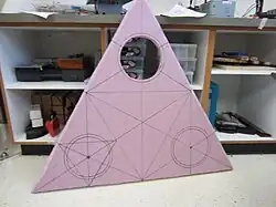 A small-scale prototype of the craft was built to gain insight into the project's scale and construction method. This prototype revealed that the scale of the craft was going to be much larger than initially suspected in order to accomodate the span of the fan propellers. The main craft body was constructed out of 0.75" thick pink insulation foam. It was made from four triangular pieces that formed a 46" equilateral triangle, and was two sheets thick (1.5"). 8.5" holes were cut at the three corners as ducts for three fans, and the top edges of the craft body were beveled to decrease drag on take-off.