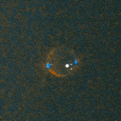 "The camera on Cassini captured images of eclipsed Io in several colors ranging from the near-ultraviolet to the near-infrared. A black-and-white movie clip of 48 clear-filter frames spanning two hours during the eclipse was released on February 5 (PIA02882). Here, two colors have been added to show the type of evidence used by imaging scientists in determining the source of Io's auroral glows. The color pictures were taken at lower resolution -- 120 kilometers (75 miles) per pixel rather than 60 kilometers(37 miles) per pixel -- and less frequently than the clear-filter images. White dots near the equator are volcanoes, some of which are much brighter than the faint atmospheric glows. The brightest of them is the volcano Pele."[1]