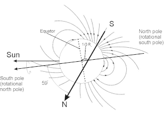 Voyager's observations revealed that the magnetic field is peculiar, both because it does not originate from the planet's geometric center, and because it is tilted at 59° from the axis of rotation.[6][7] In fact the magnetic dipole is shifted from the center of the planet towards the south rotational pole by as much as one third of the planetary radius.[6] This unusual geometry results in a highly asymmetric magnetosphere, where the magnetic field strength on the surface in the southern hemisphere can be as low as 0.1 gauss (10 µT), whereas in the northern hemisphere it can be as high as 1.1 gauss (110 µT).[6] The average field at the surface is 0.23 gauss (23 µT).[6] In comparison, the magnetic field of Earth is roughly as strong at either pole, and its "magnetic equator" is roughly parallel with its geographical equator.[7] The dipole moment of Uranus is 50 times that of Earth.[6][7] Neptune has a similarly displaced and tilted magnetic field, suggesting that this may be a common feature of ice giants.[7] One hypothesis is that, unlike the magnetic fields of the terrestrial and gas giants, which are generated within their cores, the ice giants' magnetic fields are generated by motion at relatively shallow depths, for instance, in the water–ammonia ocean.[8][9]