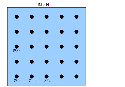 This means that the pairs differ by an diagonal element, that is, a pair, where both components coincide. This relation is an equivalence relation on ; see Exercise 45.22 . If we consider as a square lattice (a "discrete coordinate system“), then the equivalence classes are given by the points on a "discrete line“ parallel to the diagonal. The points with are equivalent to ; they have a representative where the second component is . The points with are equivalent to ; they have a representative where the first component is . The points are equivalent to . We call the representative of an equivalence class where at least one component is , the standard representative of this equivalence class. The standard representatives are the discrete points of the confining lines of the quadrant; for a point, we find its standard representative by going, parallel to the diagonal, in direction of these lines. Two points are equivalent if and only if they have the same standard representative.