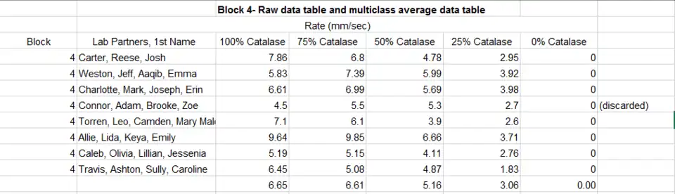 The group, "Connor, Adam, Brooke, Zoe", committed an error in their experiment with "0% Catalase", testing ".75%"--which differed with the rest of the other group's data average for "0% Catalase". Thus, their data was discarded (labeled "(discarded)").