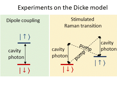 The simplest realization of the Dicke model involves the dipole coupling between two-level atoms in a cavity (see Fig. 2, left panel). In this system, the observation of the superradiant transition is hindered by two possible problems: (1) The bare coupling between atoms and cavities is usually weak and insufficient to reach the critical value , see Eq. 7 [9]. (2) An accurate modelling of the physical system requires to consider terms that according to a no-go theorem, may prevent the transition. Both limitations can be circumvented by applying external pumps on the atoms and creating an effective Dicke model in an appropriately rotating frame [10][11].