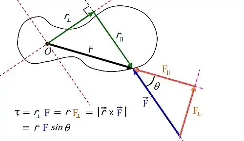 - is the torque caused by a force, F, exerted at a distance ,r, from the axis. The angle between r and F is θ.