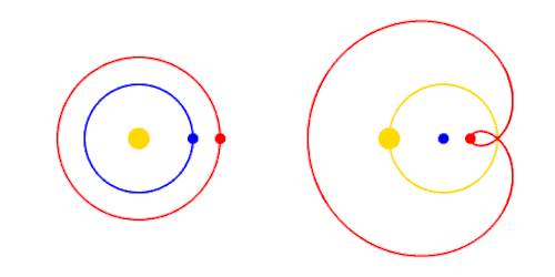 The sun is yellow, Earth is blue, and Mars is red. Both models explain opposition, conjunction, and retrograde motion.