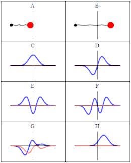 Some trajectories of a harmonic oscillator (a ball attached to a spring) in classical mechanics (A–B) and quantum mechanics (C–H). In quantum mechanics (C–H), the ball has a wave function, which is shown with real part in blue and imaginary part in red. The trajectories C,D,E,F, (but not G or H) are examples of standing waves, (or "stationary states"). Each standing-wave frequency is proportional to a possible energy level of the oscillator. This "energy quantization" does not occur in classical physics, where the oscillator can have any energy.