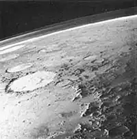At lower right is a view of the Martian atmosphere and surface taken through the Viking Orbiter violet filter to illustrate the dramatic clarity "of the atmosphere in the region east and northeast of the Argyre basin during winter in the southern hemisphere. [The image is] taken just after the winter solstice when solar heating is minimal."[4]