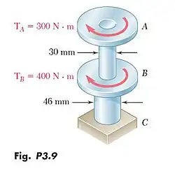 In order to reduce the total mass of the assembly of Prob 3.9, a new design is being considered in which the diameter of shaft BC will be smaller. Determine the smallest diameter of shaft BC for which the maximum value of the shearing stress in the assembly will not increase.