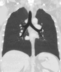 A CT scan can be used for detecting both acute and chronic changes in the lung parenchyma, the tissue of the lungs.[66] It is particularly relevant here because normal two-dimensional X-rays do not show such defects. A variety of techniques are used, depending on the suspected abnormality. For evaluation of chronic interstitial processes such as emphysema, and fibrosis,[67] thin sections with high spatial frequency reconstructions are used; often scans are performed both on inspiration and expiration. This special technique is called high resolution CT that produces a sampling of the lung, and not continuous images.[68]