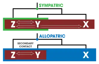 After speciation by reinforcement occurs, changes after complete reproductive isolation (and further isolation thereafter) are a form of reproductive character displacement.[21] A common signature of reinforcement's occurrence in nature is that of reproductive character displacement; characteristics of a population diverge in sympatry but not allopatry.[6][5] One difficulty in detection is that ecological character displacement can result in the same patterns.[22] Further, gene flow can diminish the isolation found in sympatric populations.[22] Two important factors in the outcome of the process rely on: 1) the specific mechanisms that causes pre-zygotic isolation, and 2) the number of alleles altered by mutations affecting mate choice.[23] In instances of peripatric speciation, reinforcement is unlikely to complete speciation in the case that the peripherally isolated population comes into secondary contact with the main population.[24] In sympatric speciation, selection against hybrids is required; therefore reinforcement can play a role, given the evolution of some form of fitness trade-offs.[1] In sympatry, patterns of strong mating discrimination are often observed—being attributed to reinforcement.[7] Reinforcement is thought to be the agent of gametic isolation.[25]