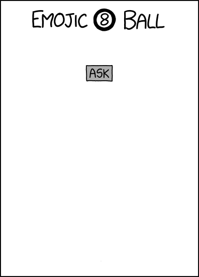 [[A text box where you can enter a question, with a default question of 'How will I die?, and an 'ASK' button underneath. Below is a drawing of a 'magic 8 ball' toy, and in the center a white triangle comes up with 1-3 random emojis.]]