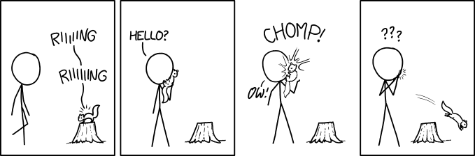 {{Title text: After a while, the squirrel starts making that beeping noise and doesn't stop until it hops back up onto the stump.}}