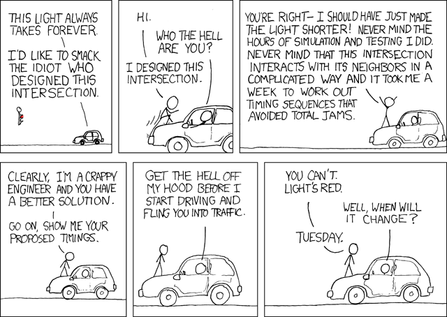 Engineer [[arms spread outward]] : You're right - I should have just made the light shorter! Never mind the hours of simulation and testing I did. Never mind that this intersection interacts with it's neighbors in a complicated way and it took me a week to work out timing sequences that avoided total jams.