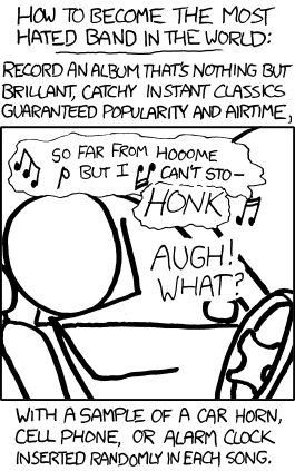 {{Title text: There are two or three songs out there with beeps in the chorus that sound exactly like the clock radio alarm I had in high school, and hearing it makes me think my life since junior year has been a dream I'm about to wake up from.}}