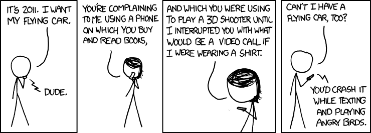 Person (on phone): It's 2011. I want my flying car.